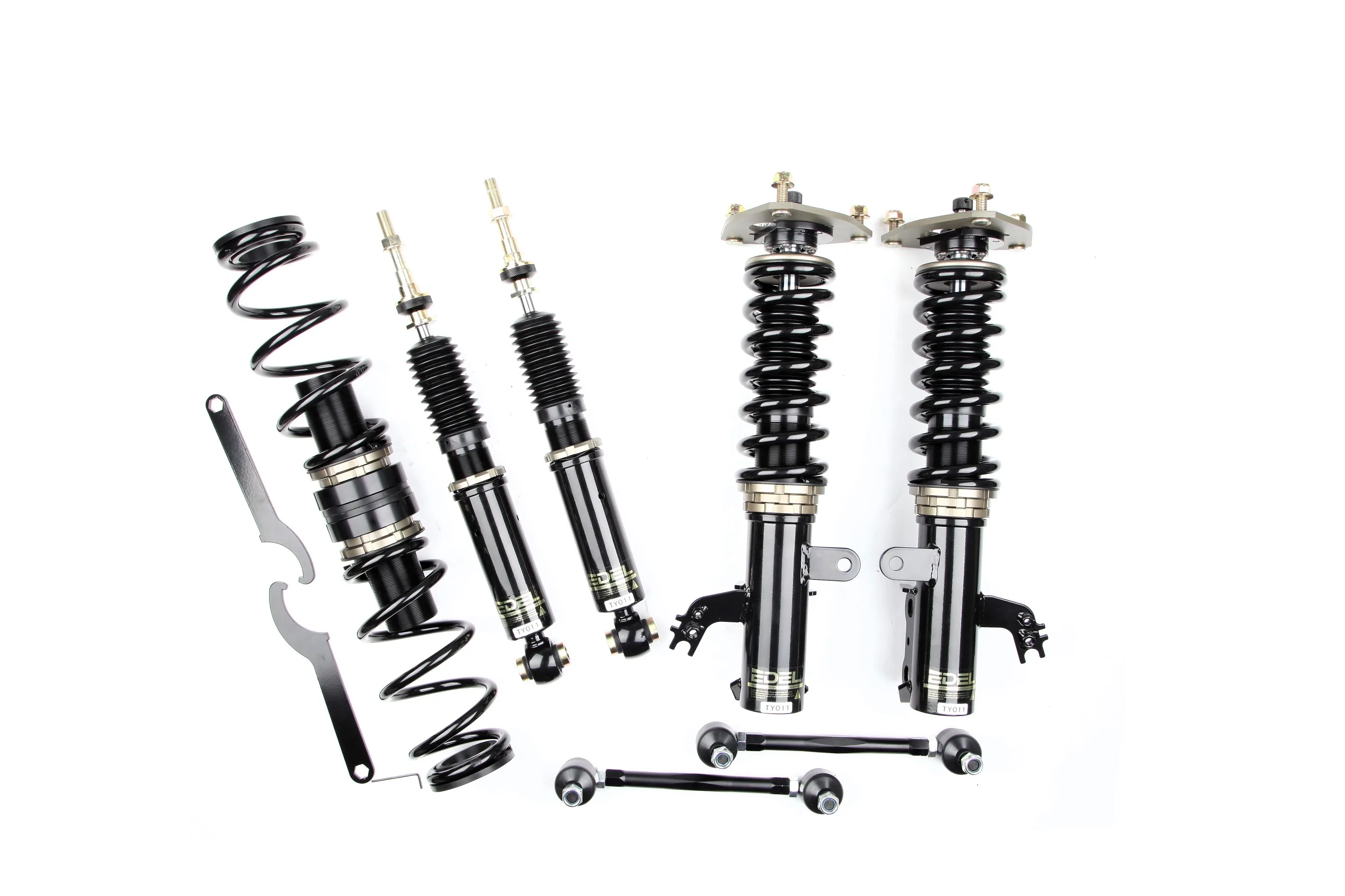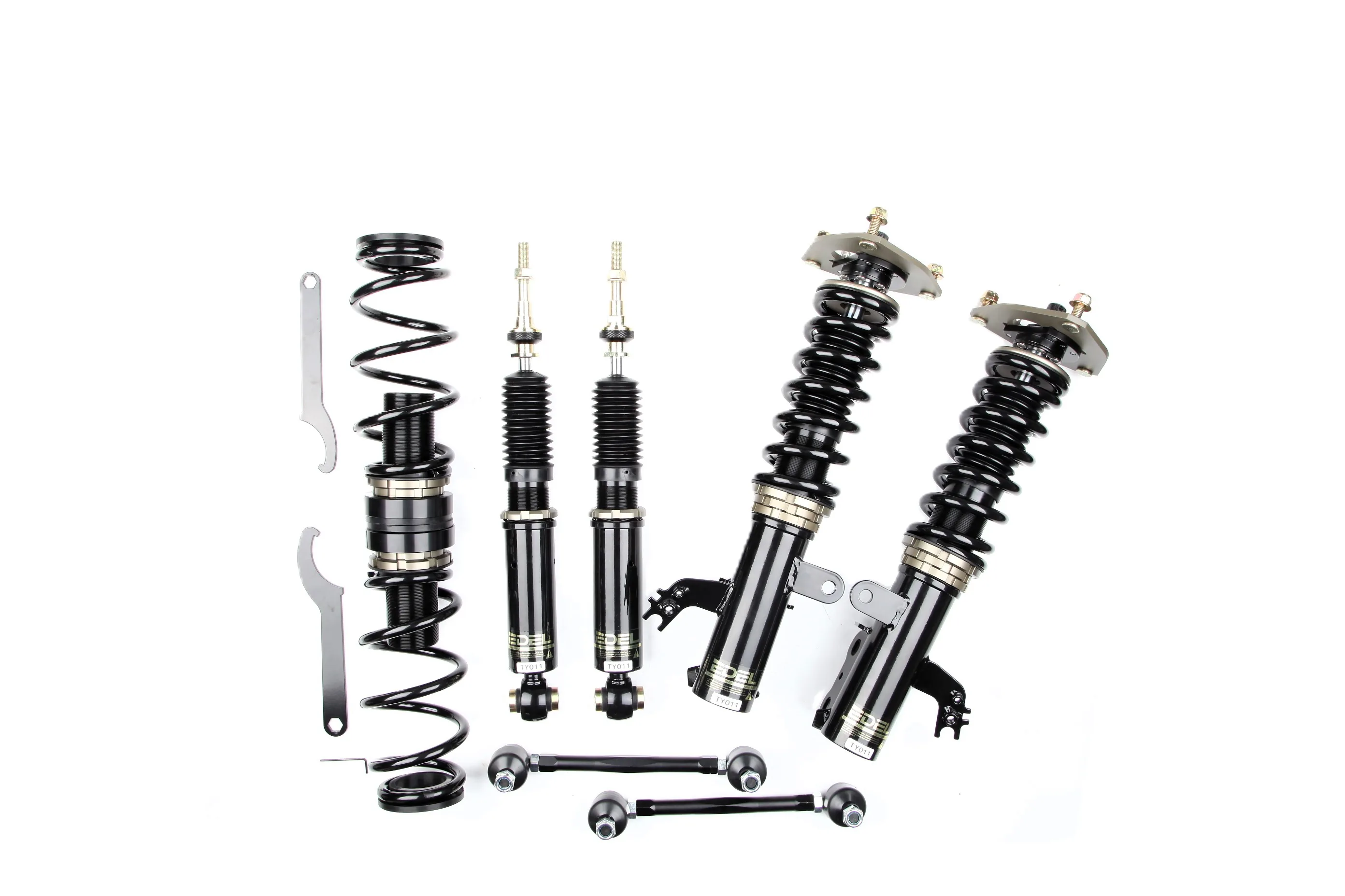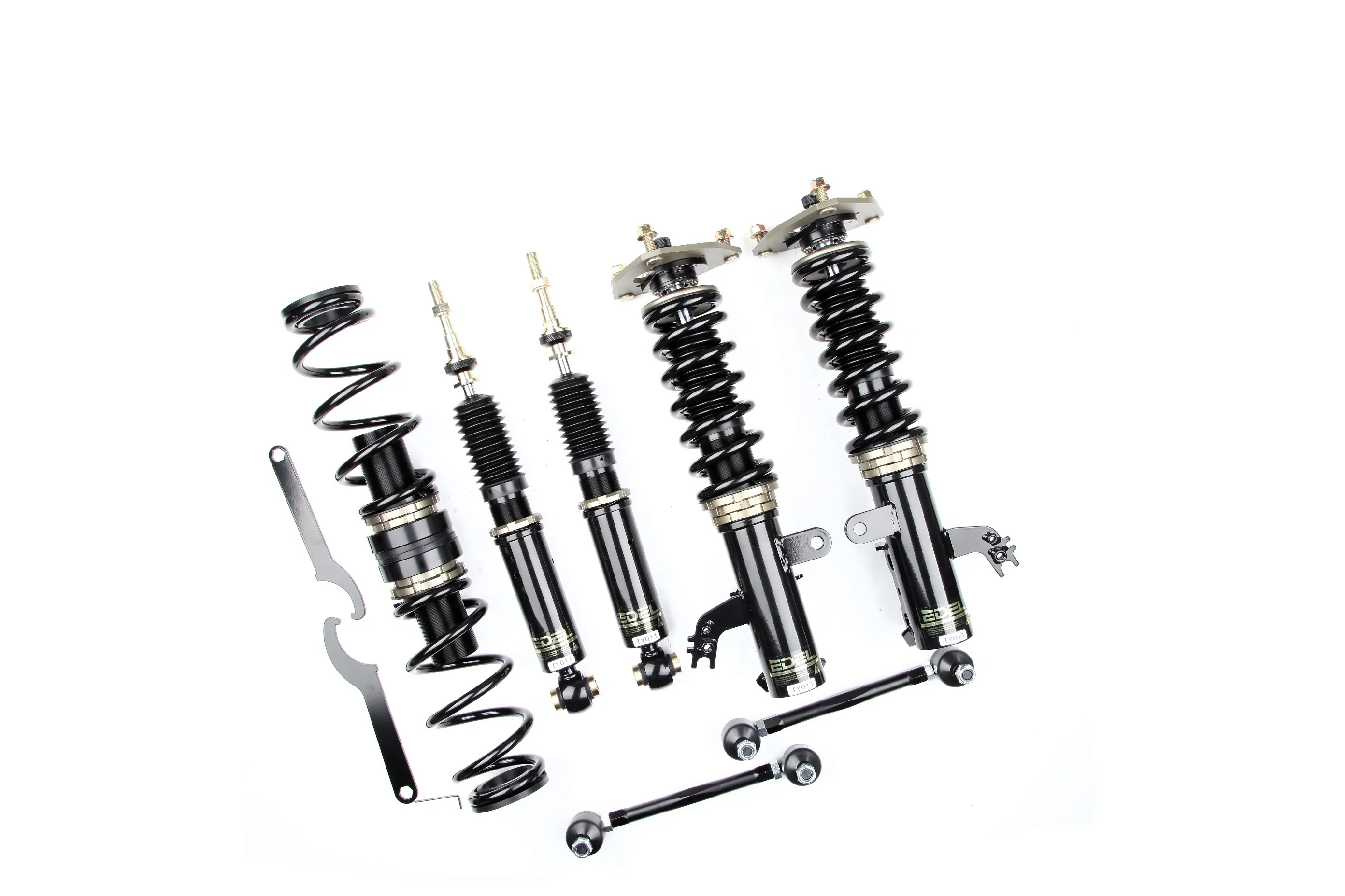 Пружины перед 8 кг, зад 6 кг. Полный комплект регулируемых амортизаторов перед + зад (4шт). Задние койловеры без шаровых соединений (на резиновых втулках). Фултап, регулировка высоты и жесткости 32 щелчка. Производство в г. Шанхай. Собственный завод.